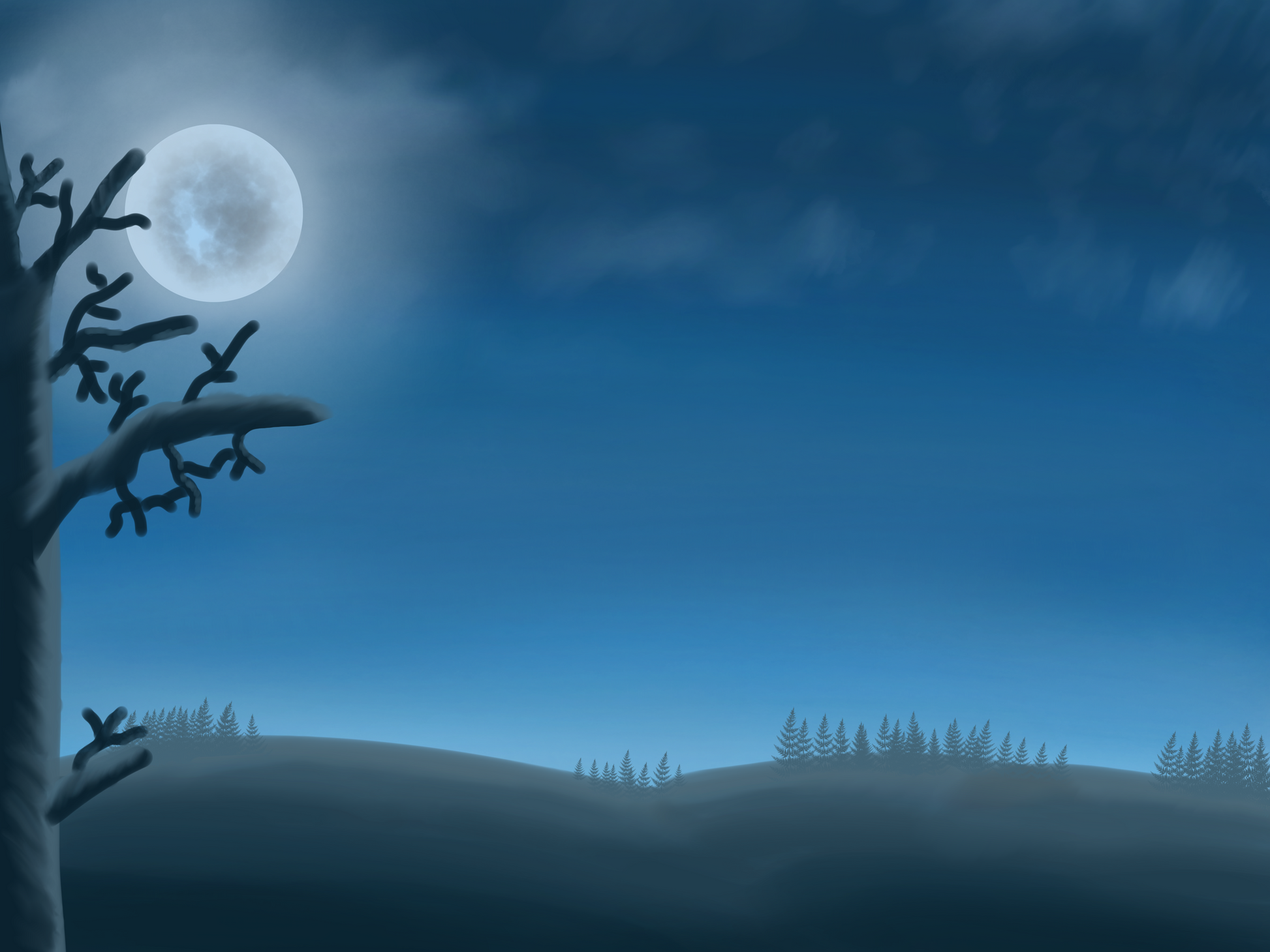 Description: A soft, glowing moon illuminates a distant forest ridge. This high-atmosphere digital painting offers a sense of vastness and peace, making it a beautiful choice for website banners or ambient video backgrounds.